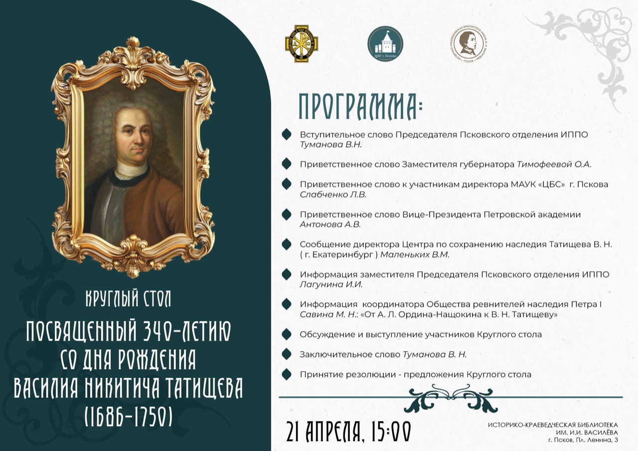 Действительный член ИППО, член-корреспондент ПАНИ, действительный член Санкт-Петербургского Морского Собрания Сергей Николаевич Савин рассказал о планах создания отделения Петровской академии науки и искусств в Пскове. Академия учредила премию в честь В.Н. Татищева за выдающиеся заслуги, связанные с развитием науки, культуры и государственности.